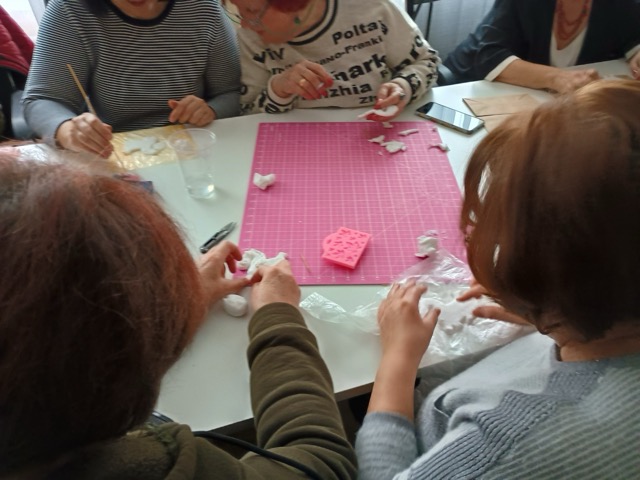 Для роботи використовували синтетичну пластикову глину, яку можна придбати у вільному доступі. Вона швидко застигає, але потребує варіння — після цього фігурку можна розмальовувати на свій смак. Наставницею заняття стала майстриня Антоніна Нікіцька, котра детально пояснювала кожен етап: від створення основи до наліплення деталей.