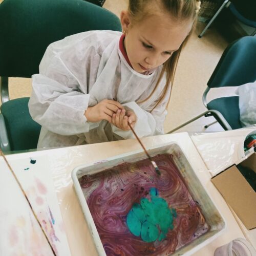 Одним із найяскравіших видів творчості стало малювання в техніці ебру — стародавнього мистецтва створення візерунків на воді. Під час занять діти поринули у світ кольору й фантазії, спостерігаючи, як фарби чарівно розтікаються по водній поверхні та перетворюються на дивовижні візерунки.