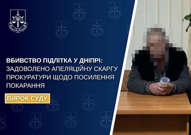 За процесуального керівництва ювенальних прокурорів Лівобережної окружної прокуратури міста Дніпра апеляційний суд ухвалив вирок, яким 35-річного чоловіка засуджено до 15 років позбавлення волі за умисне вбивство підлітка, вчинене з хуліганських мотивів (п. 7 ч. 2 ст. 115 КК України).
